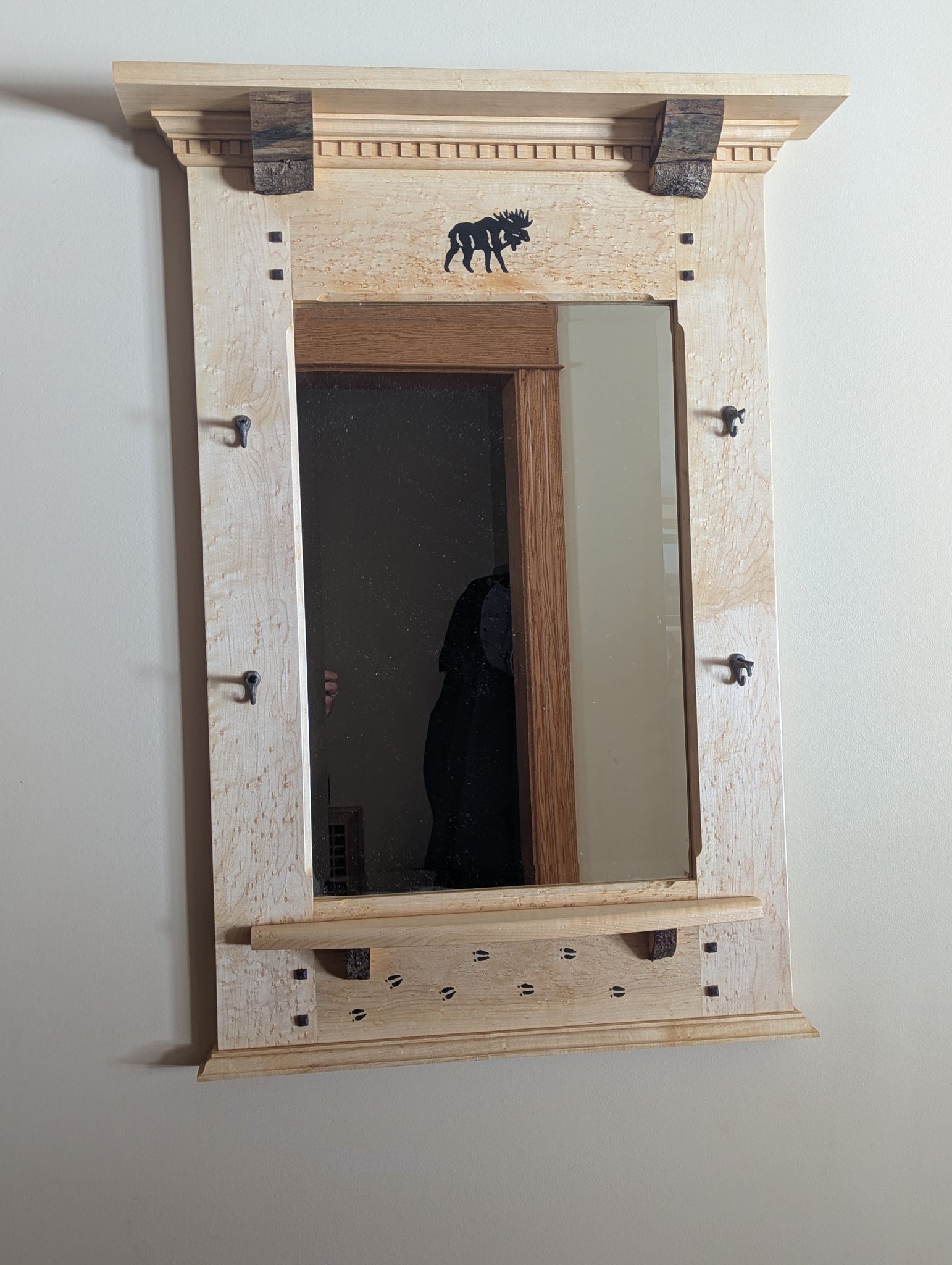 This framed beveled glass mirror is made from very rare bird's eye maple harvested in the northern Adirondacks. Bird's eye maple is an extremely rare anomaly that occurs in maple trees. It is estimated that 1 in 100,000 maple boards are bird's eye maple. This mirror is solid bird's eye maple. Most bird's maple logs are milled into veneer as it brings the logger more money and making solid bird's eye maple pieces even rarer. I was fortunate enough to be able to purchase 7 boards at a local saw mill (enough for two mirrors}. This mirror features an inlayed moose. The frame is mortised together and pegged with chamfered walnut pegs. The top shelf features dental molding and both the upper and lower shelves feature log supports. Four vintage maple syrup taps dated 1891 are mounted on the sides as well and serve as hooks for hanging things. The beveled glass mirror is 16 inches wide by 24 inches high. The top shelf is 27 1/4 in length and approximately 4 1/2 inches wide. The mirror frame is 23 inches wide and the entire frame is 37 1/4 inches in height. The mirror mounts using a french cleat (provided). This is a very well-made piece of home decor featuring a tasteful and quintessentially Adirondack rustic flair.